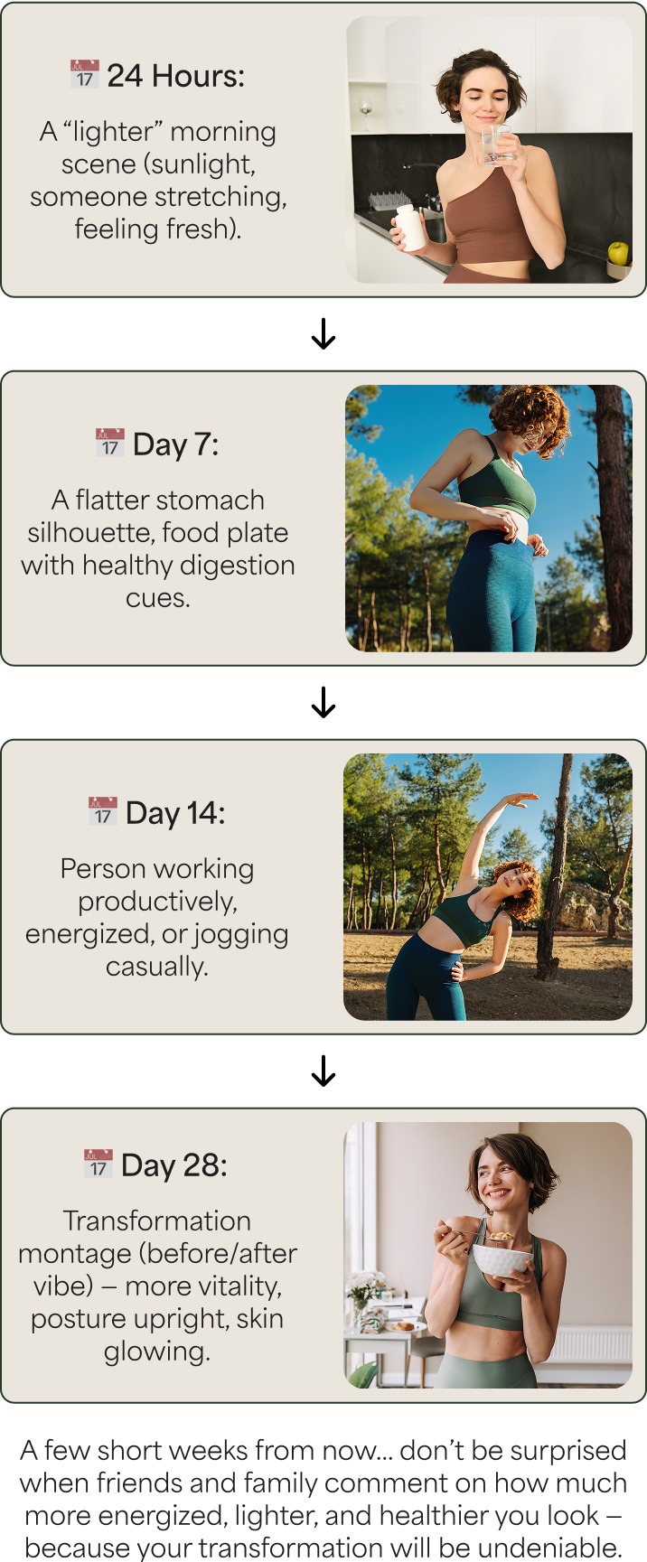 A few short weeks from now… don’t be surprised when friends and family comment on how much more energized, lighter, and healthier you look — because your transformation will be undeniable.